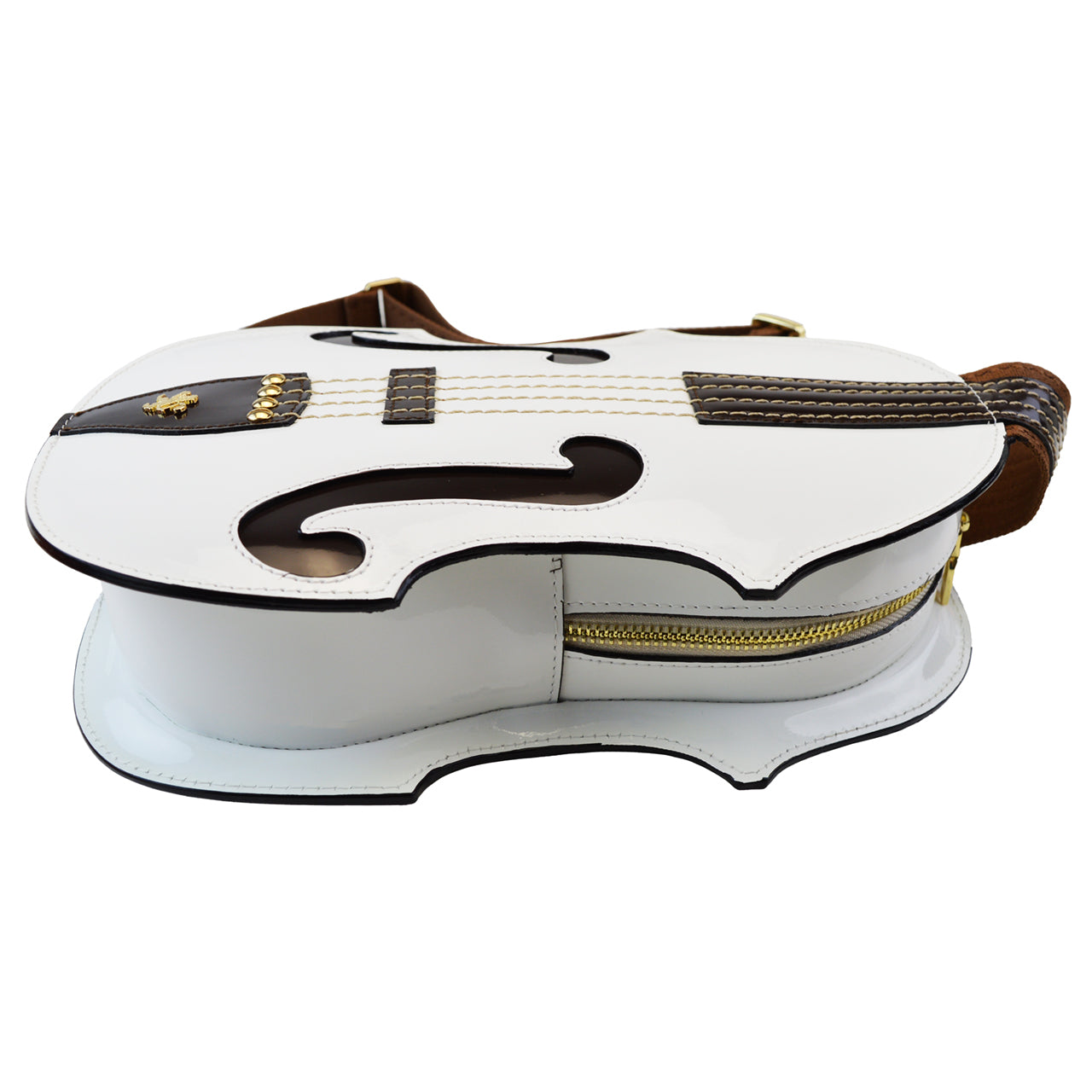 The Violino is a small backpack crafted from genuine Italian patent leather, distinguished by its elegant semi-rigid structure and its unique violin-inspired shape. It features a spacious main compartment with secure zipper closure. Inside, a timed LED light enhances visibility, making it effortless to locate your favorite accessories at any moment.