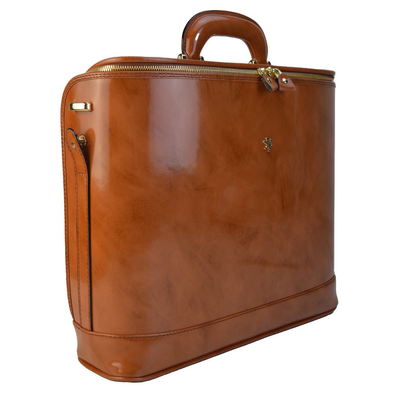 Introducing the Raffaello PC Briefcase in Italian Brunelleschi Leather, a truly innovative and luxurious product from Pratesi. This high class bag is crafted from polished hand printing leather, giving it a sleek and sophisticated look. But it's not just about the appearance - this bag is also highly functional. It can be opened like a traditional briefcase or like an attaché case, providing versatility for any situation. But that's not all - the Raffaello PC Briefcase also features a unique courtesy light that turns on automatically and turns off after 30 seconds. Inside, you'll find a zip pocket, mobile phone pocket, pen and business card pocket, ensuring that all your essentials are organized and easily accessible. The bag also comes with a key padlock closure for added security. Not only is this briefcase practical, it's also stylish. The calf leather material and full brass hardware exude luxury and sophistication. The metal cover by leather handles/strap adds a touch of elegance. And with a weight of just 1.6 kg, it's lightweight and easy to carry. Made in Italy, this briefcase is a true testament to quality and craftsmanship. It even comes with a dust bag for storage and protection. And with fast shipping, you can have this exceptional product in your hands in just 24 hours. Upgrade your professional style with the Raffaello PC Briefcase from Pratesi.