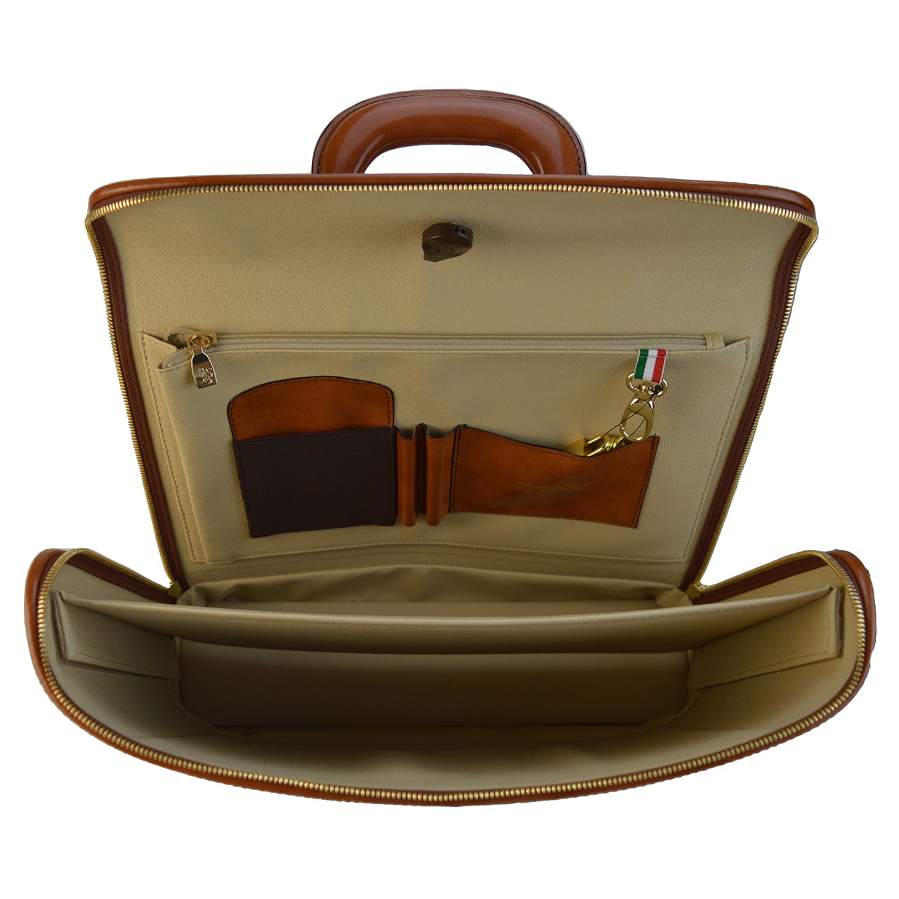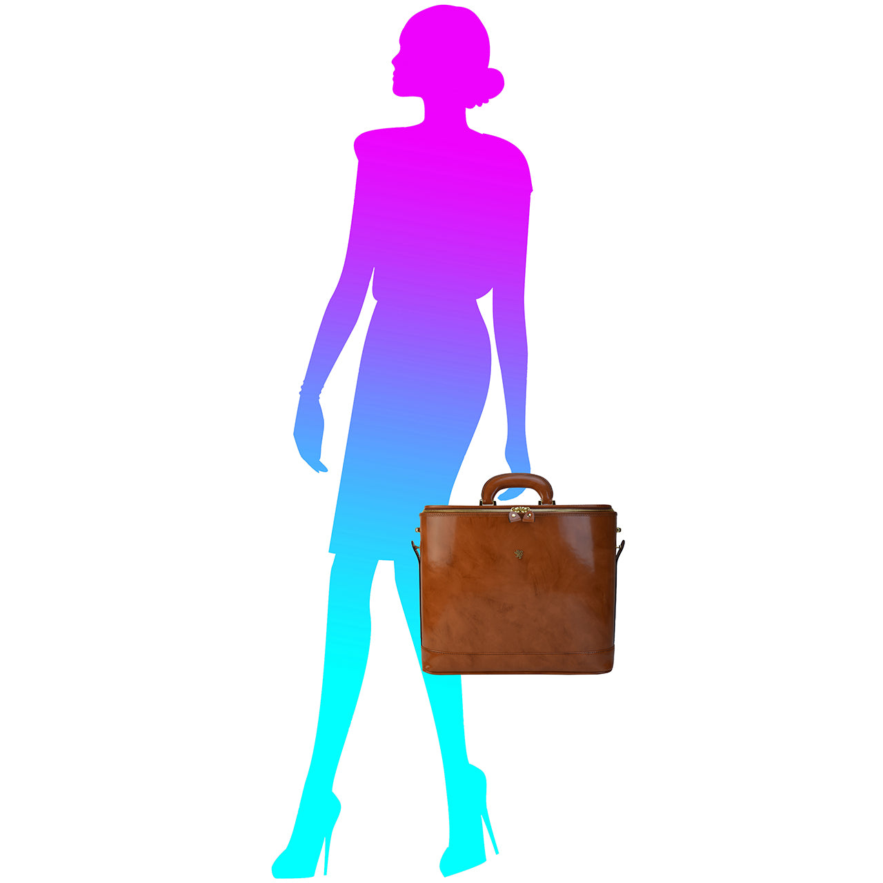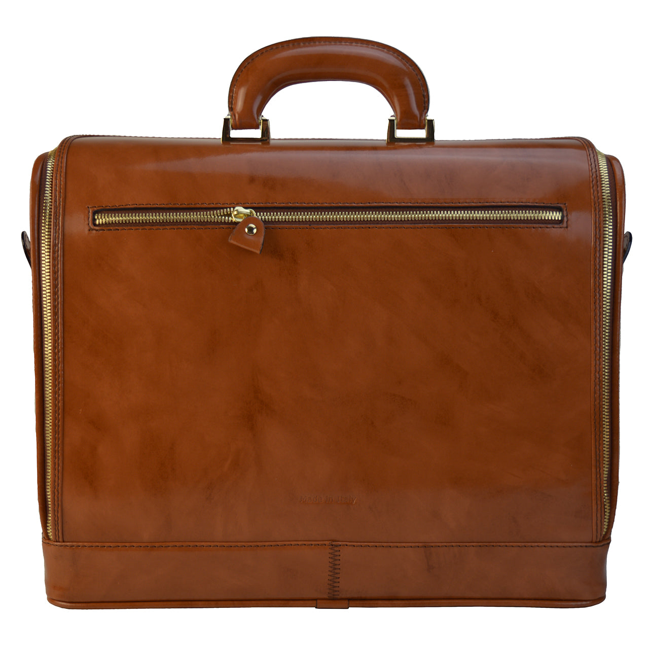 Introducing the Raffaello PC Briefcase, a luxurious addition to your professional wardrobe. Made from the finest Italian Brunelleschi leather, this bag exudes elegance and sophistication. Its polished hand printing adds a touch of class, making it the perfect accessory for any stylish individual.This versatile bag can be opened like a traditional briefcase or used as an attaché case, giving you the flexibility to carry it in whichever way suits your needs. It also features a convenient courtesy light that automatically turns off after 30 seconds, making it easy to find your belongings in low light.Inside, you'll find a zip pocket, mobile phone pocket, and compartments for pens and business cards. The bag closes securely with a key padlock, ensuring the safety of your belongings. It also comes with a removable shoulder strap and an outside pocket for added convenience.Crafted in Italy, this bag is a testament to the country's renowned leather craftsmanship. It is made from high-quality calf leather and features full brass hardware, adding to its durability and timeless appeal. The bag measures 38 cm in width, 33 cm in height, and 10 cm in depth, making it the perfect size for carrying your essentials.Weighing only 1.6 kg, this bag is lightweight and easy to carry. It also comes with a dust bag for storage and protection. Order now and enjoy fast shipping within 24 hours. Elevate your style with the Raffaello PC Briefcase, available now at our e-commerce store.