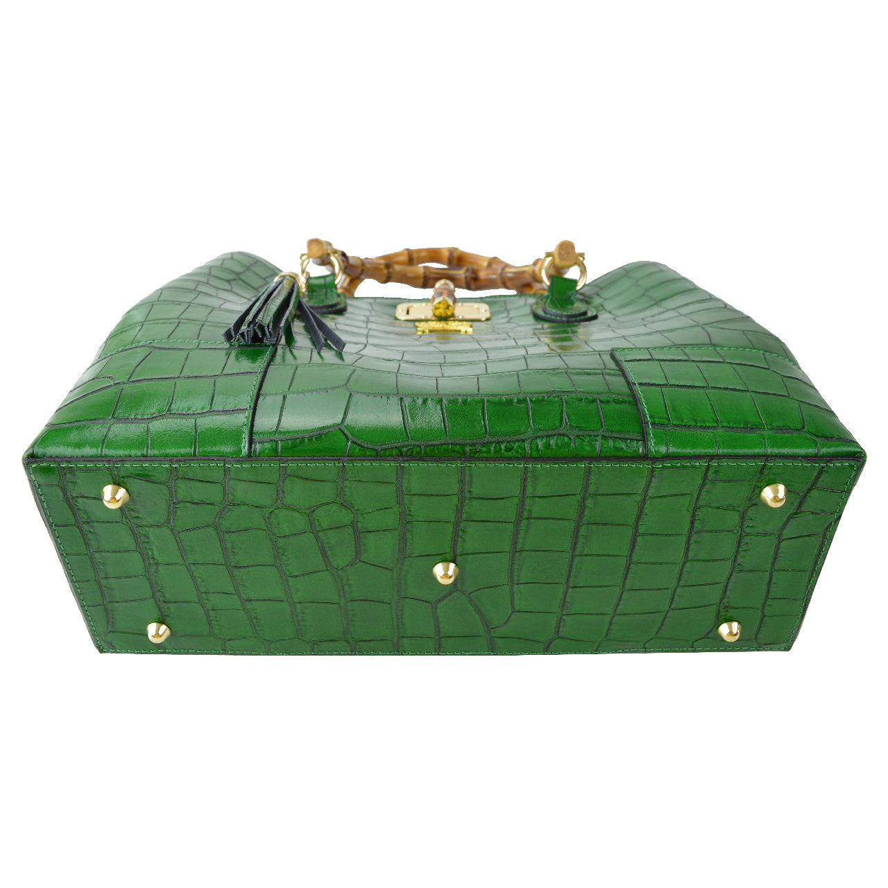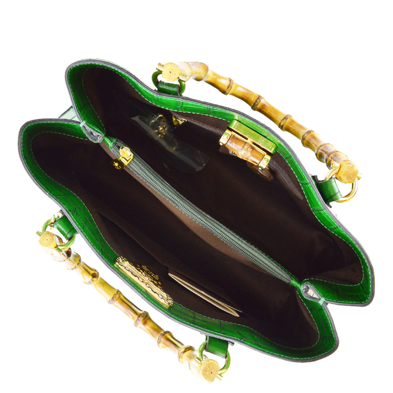 Elegant and attention to detail, the Sarteano bag is a versatile accessory that can elevate any outfit. Its compact and linear shape, along with its bamboo handle and turn-lock closure, exude class and sophistication. The spacious interior is divided by a zippered pocket and features two additional pockets for documents and a timed LED light. The gold-colored metal hardware adds a touch of luxury.