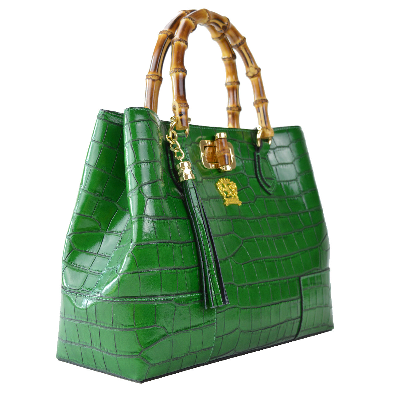 Compact in its linear shape and featuring a turn-lock closure, this bag is adorned with a bamboo handle and a spacious compartment divided by a zippered pocket. The interior also includes two convenient pockets for documents and a zippered pocket with a timed LED light. The metal parts are gold-colored, adding a touch of luxury to the bag.