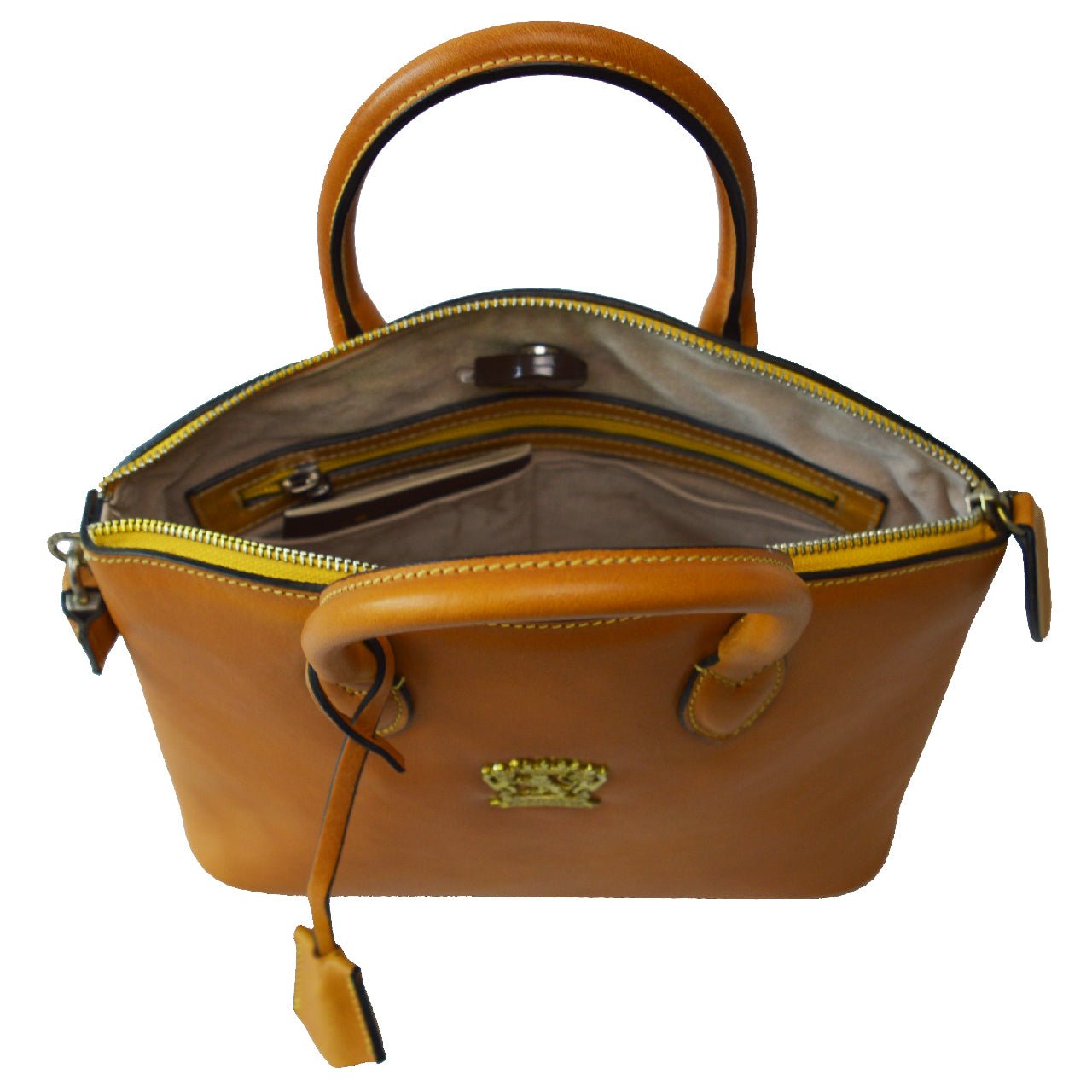 The interior of the Versilia is lined with a classic tartan fabric and features two smaller pockets in addition to the main compartment. A convenient LED light is also included. The bag closes securely with a metal zipper and is equipped with two leather handles. For added versatility, a detachable shoulder strap is also included, allowing the bag to be worn as a satchel.