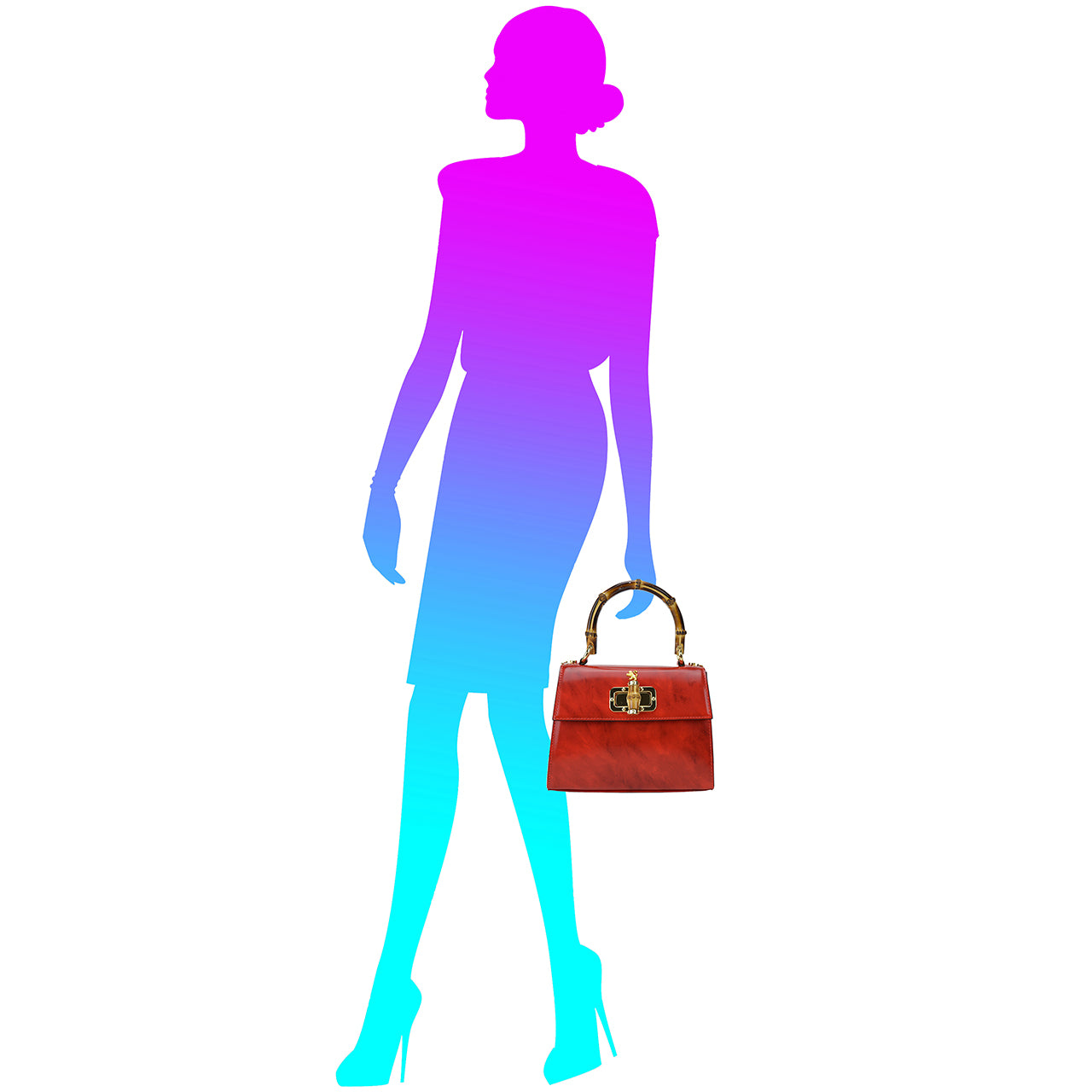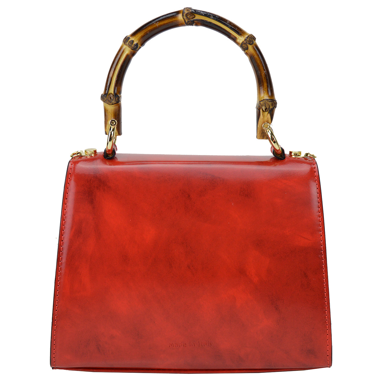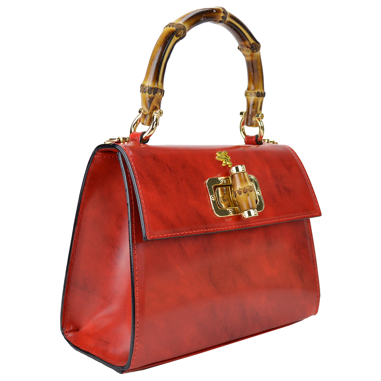 The Castalia handbag from Pratesi is a timeless and elegant addition to any wardrobe. This kelly style structured handbag is crafted from 100% genuine leather and is available in the classic Brunelleschi color. The Castalia features a solid structure with a short leather handle and gold toned metallic accents, including the small Pratesi logo and rings and screws attaching the handle to the bag. With measurements of 22,5x17,5x10,5 cm, this handbag is the perfect size for everyday use. Add a touch of sophistication to your look with the Castalia handbag from Pratesi.