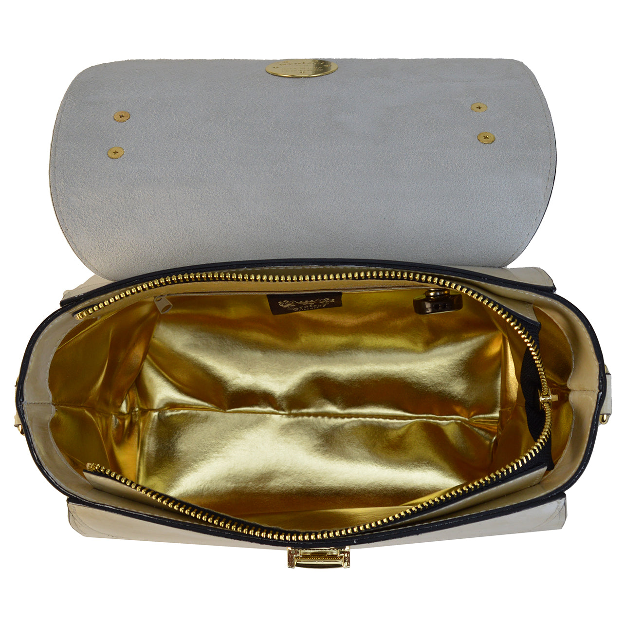 Inside, the Caiano offers a large storage compartment and a smaller pocket with zip, as well as a timed LED light. The bag closes with a clip and is equipped with two leather handles and a detachable leather shoulder strap. All hardware is made of polished gold-colored brass.
