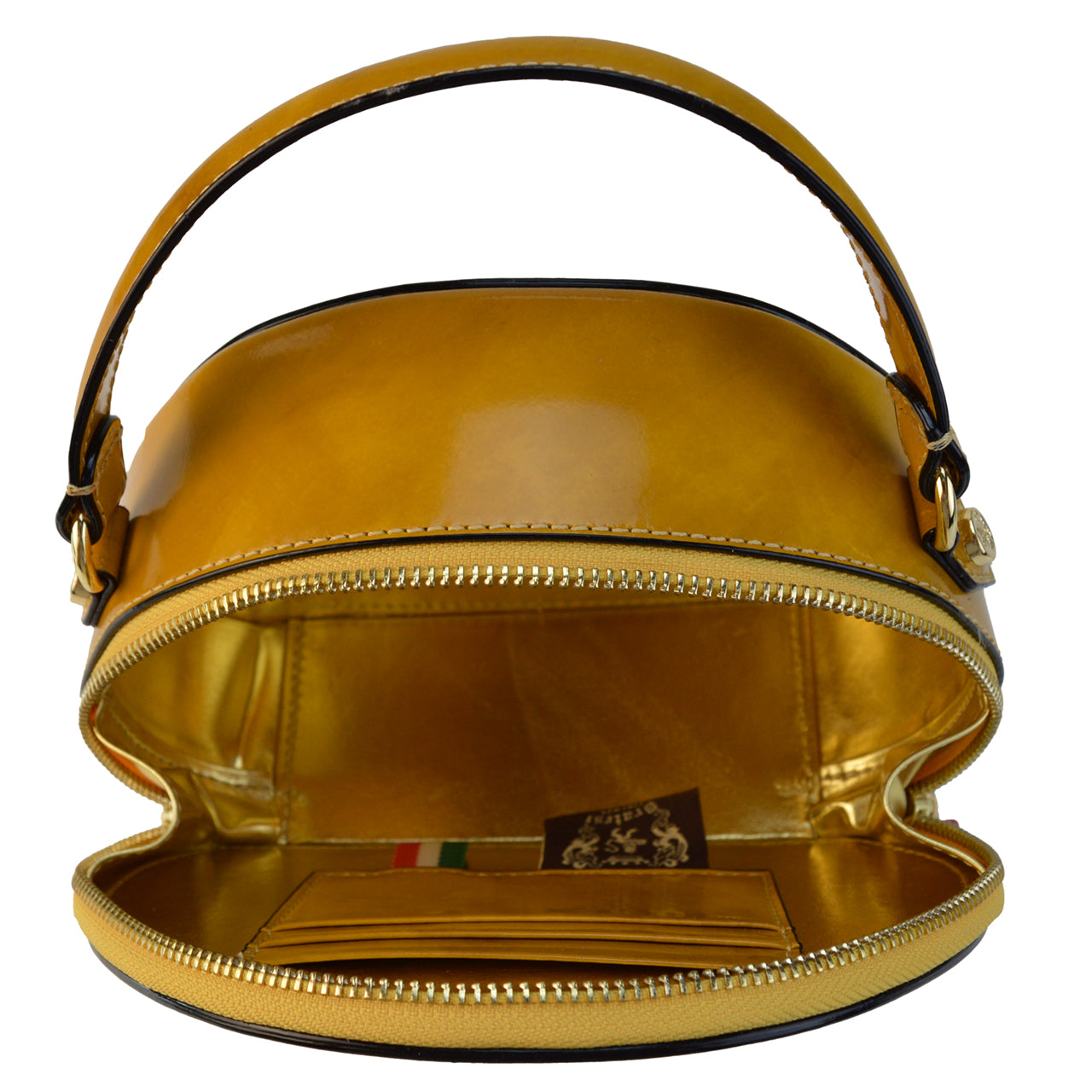 The Verona Gran Gala Handbag is a luxurious and versatile accessory made from genuine Italian Brunelleschi leather. Its rigid structure features a spacious main compartment with a secure zip closure. Inside, there is a convenient card holder pocket for credit cards, documents, and other essentials. On the other side, a timed light makes it easy to find your favorite accessories. The metal parts are elegantly finished in Gold color.
